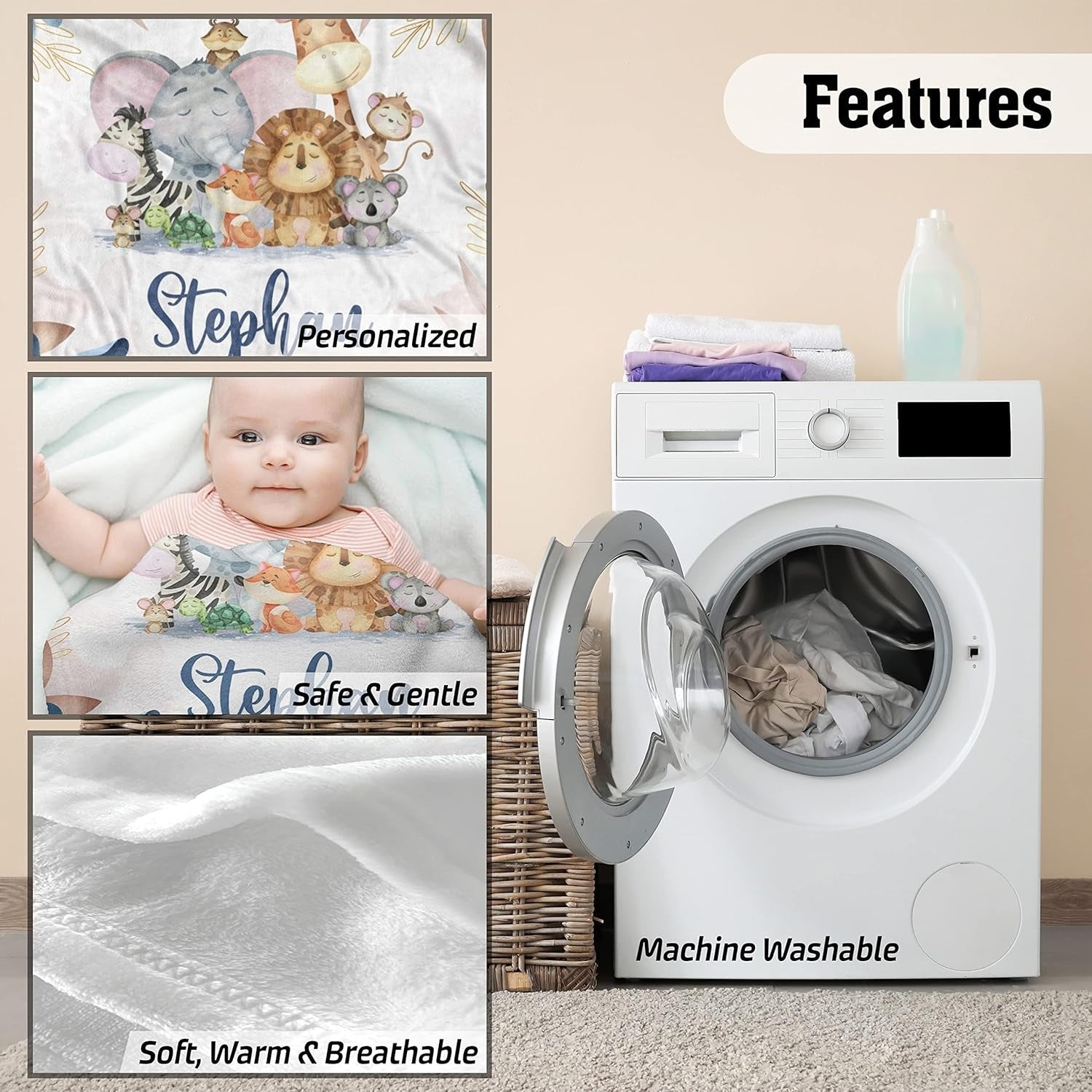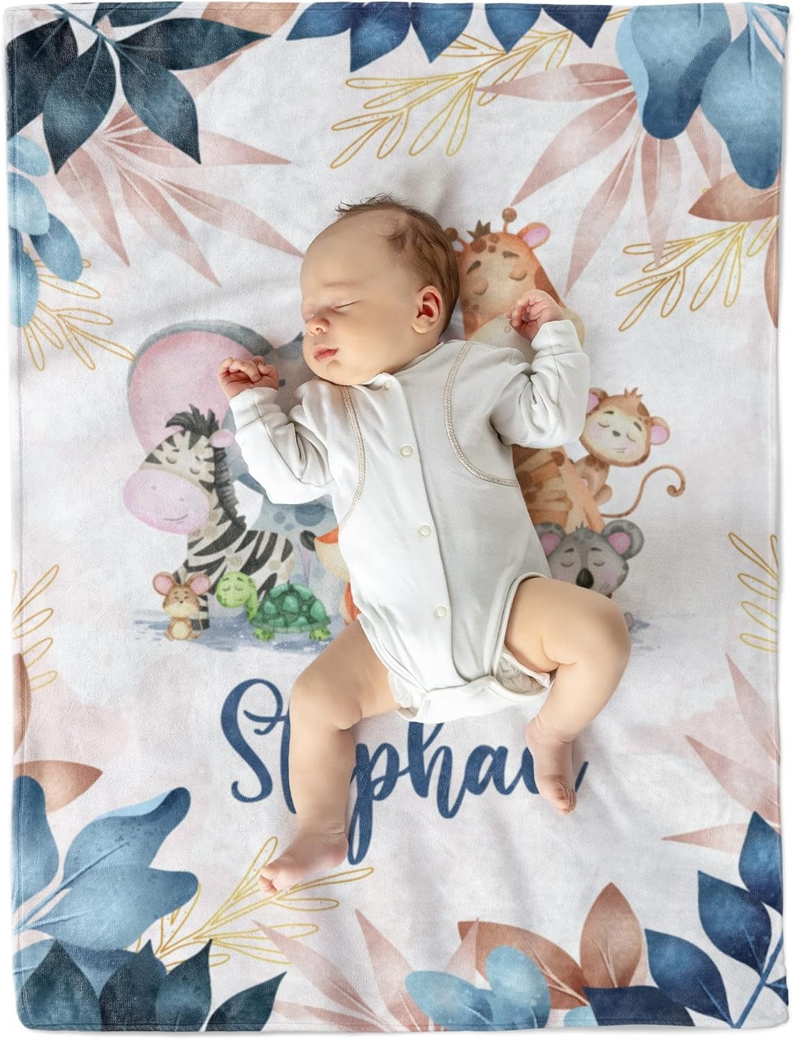 Custom Baby Boy Blanket with Name – Safari Jungle Animals Design
