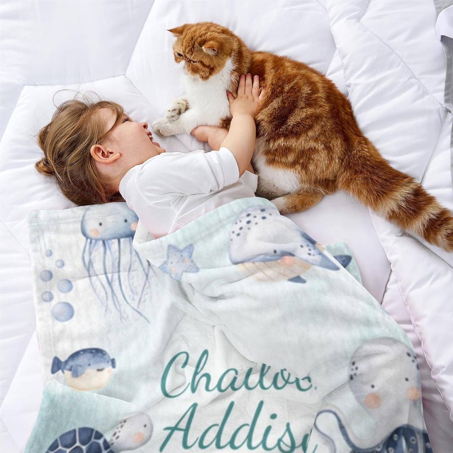 Personalized Baby Blanket with Name for Girls, Custom Blue Ocean Baby Blanket