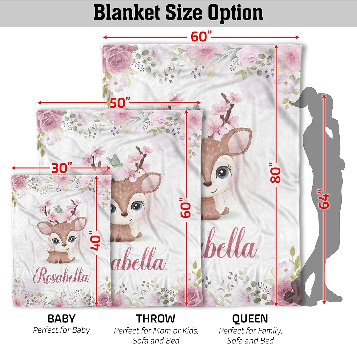 Personalized Baby Girl Blanket with Name – Custom Deer and Floral Fleece Blanket, Soft & Machine Washable